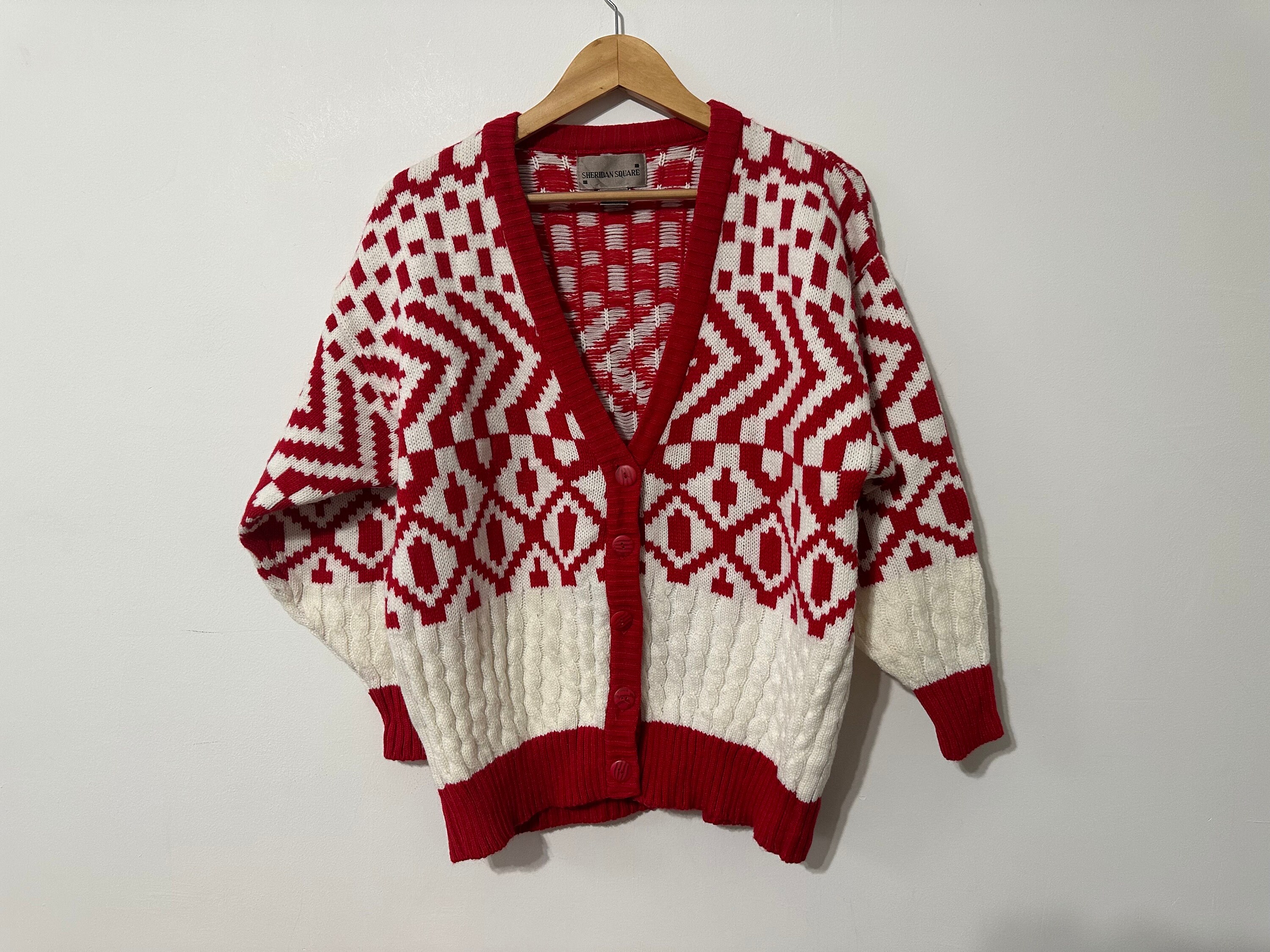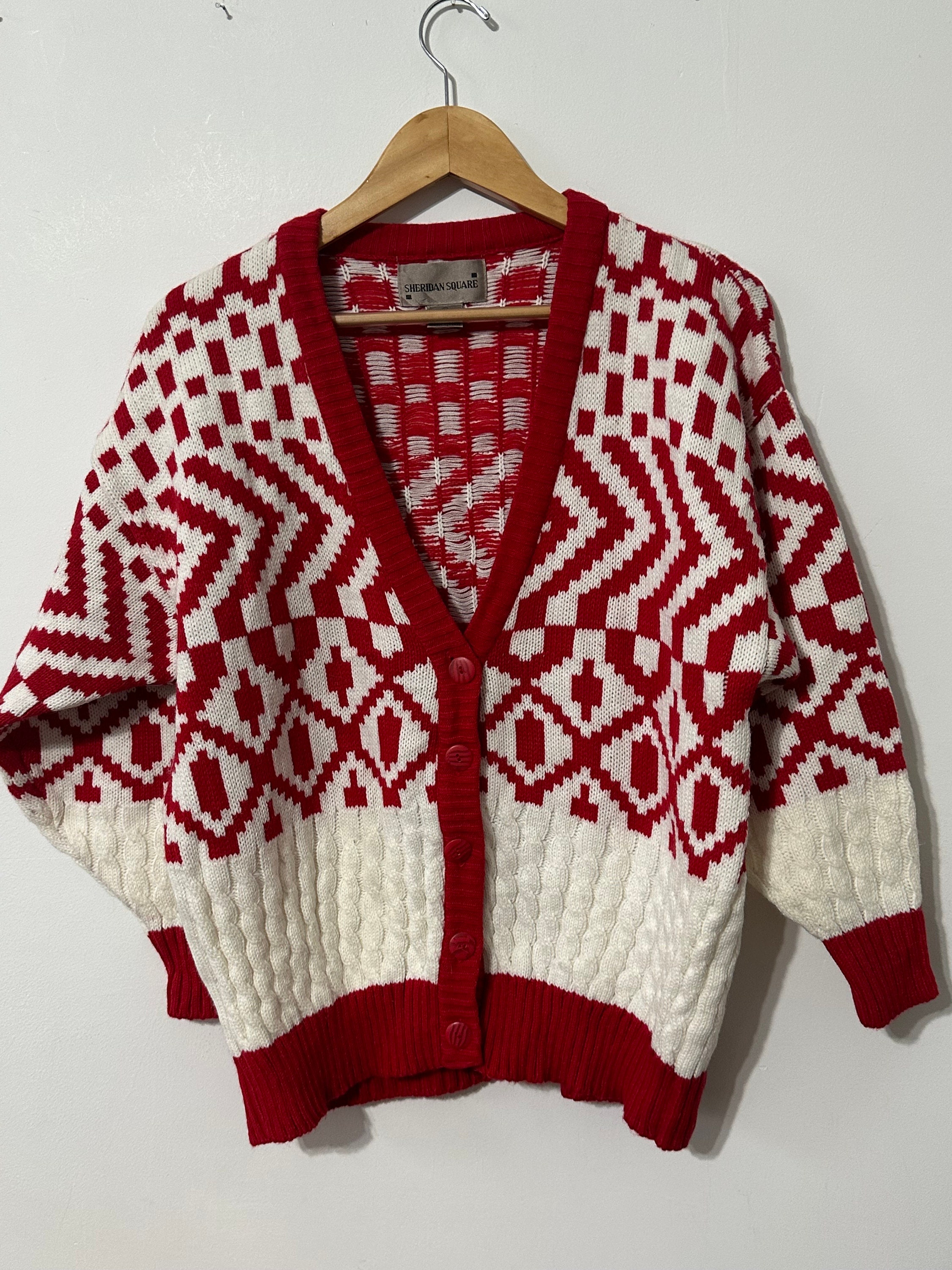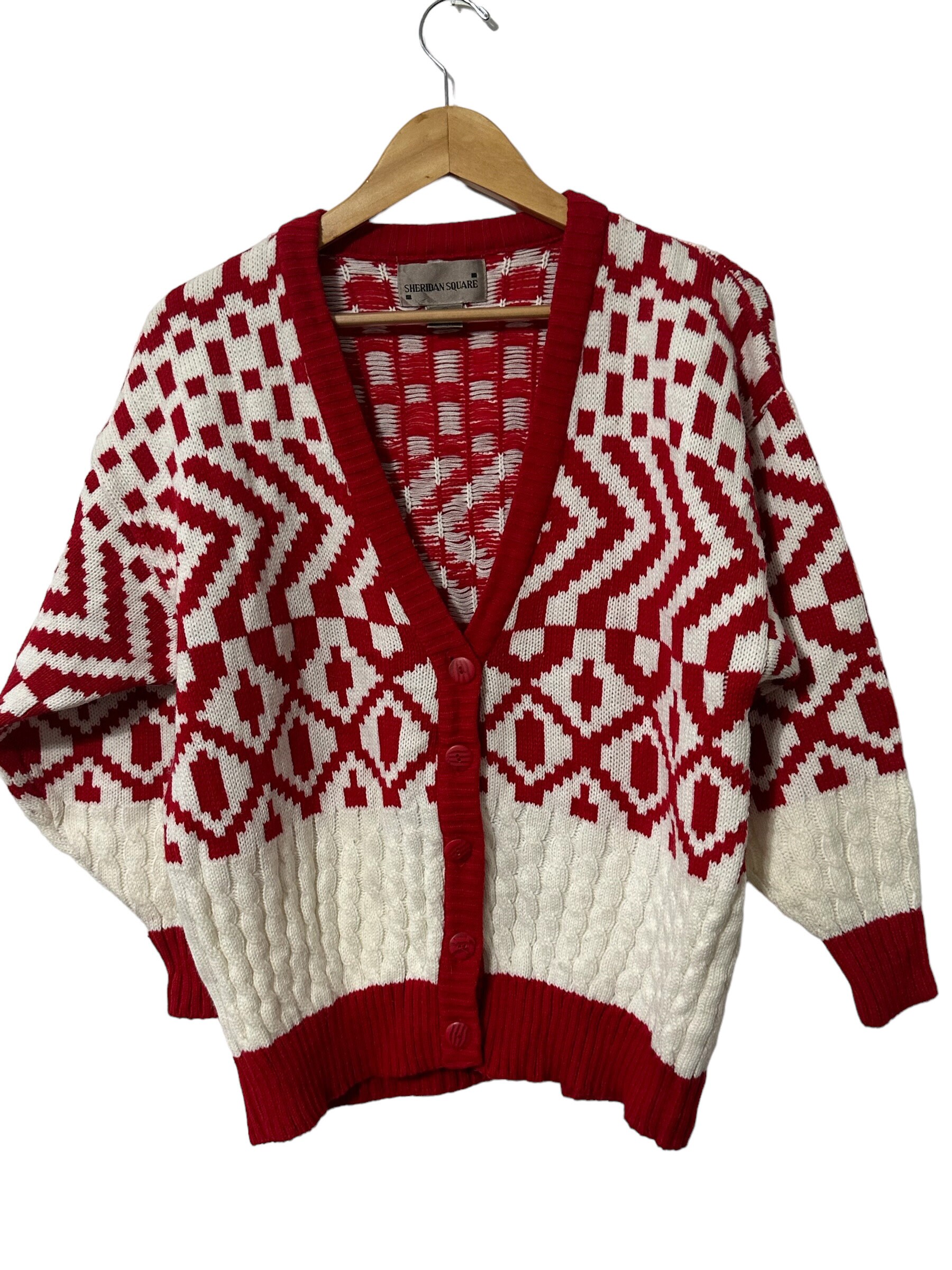Vintage Red White Acrylic Cardigan Sweater Women Size Large