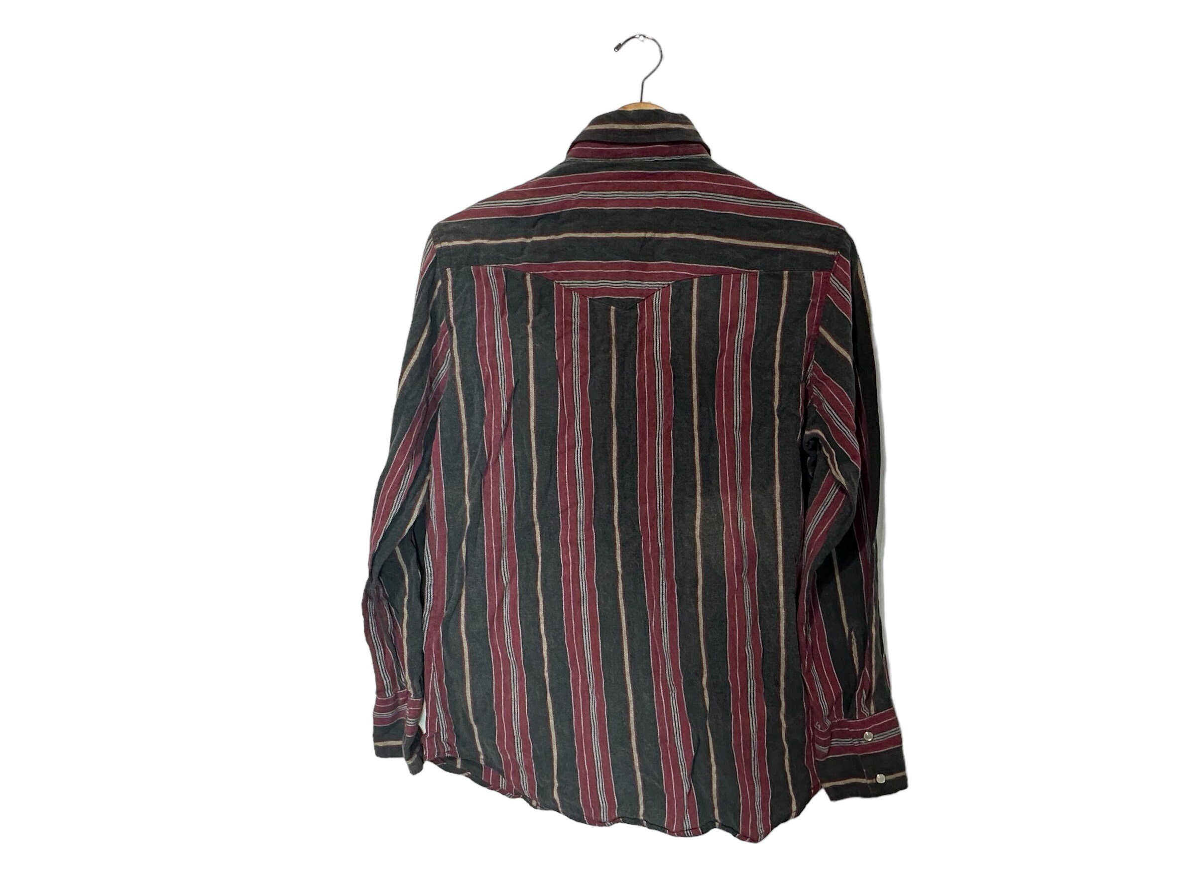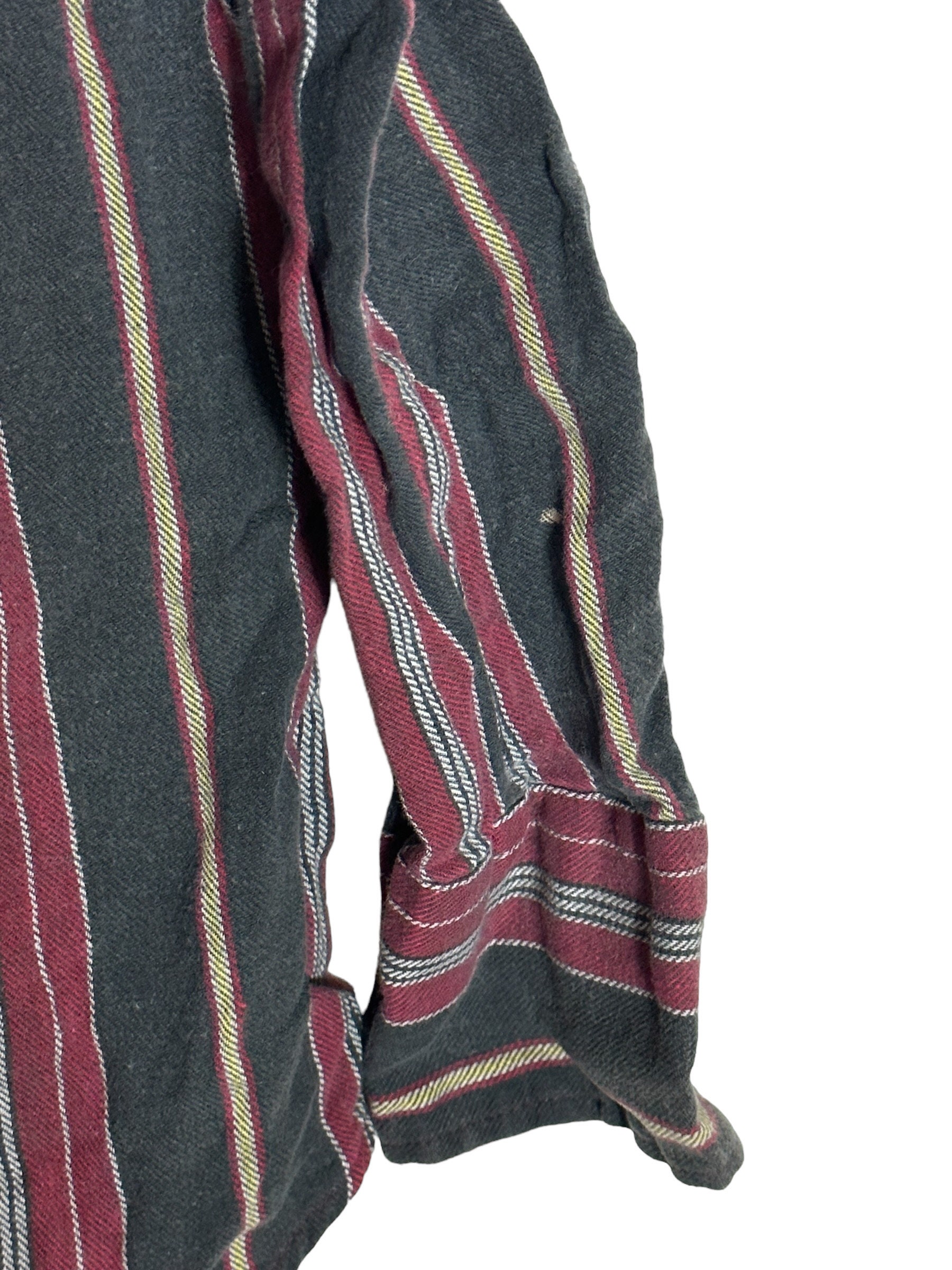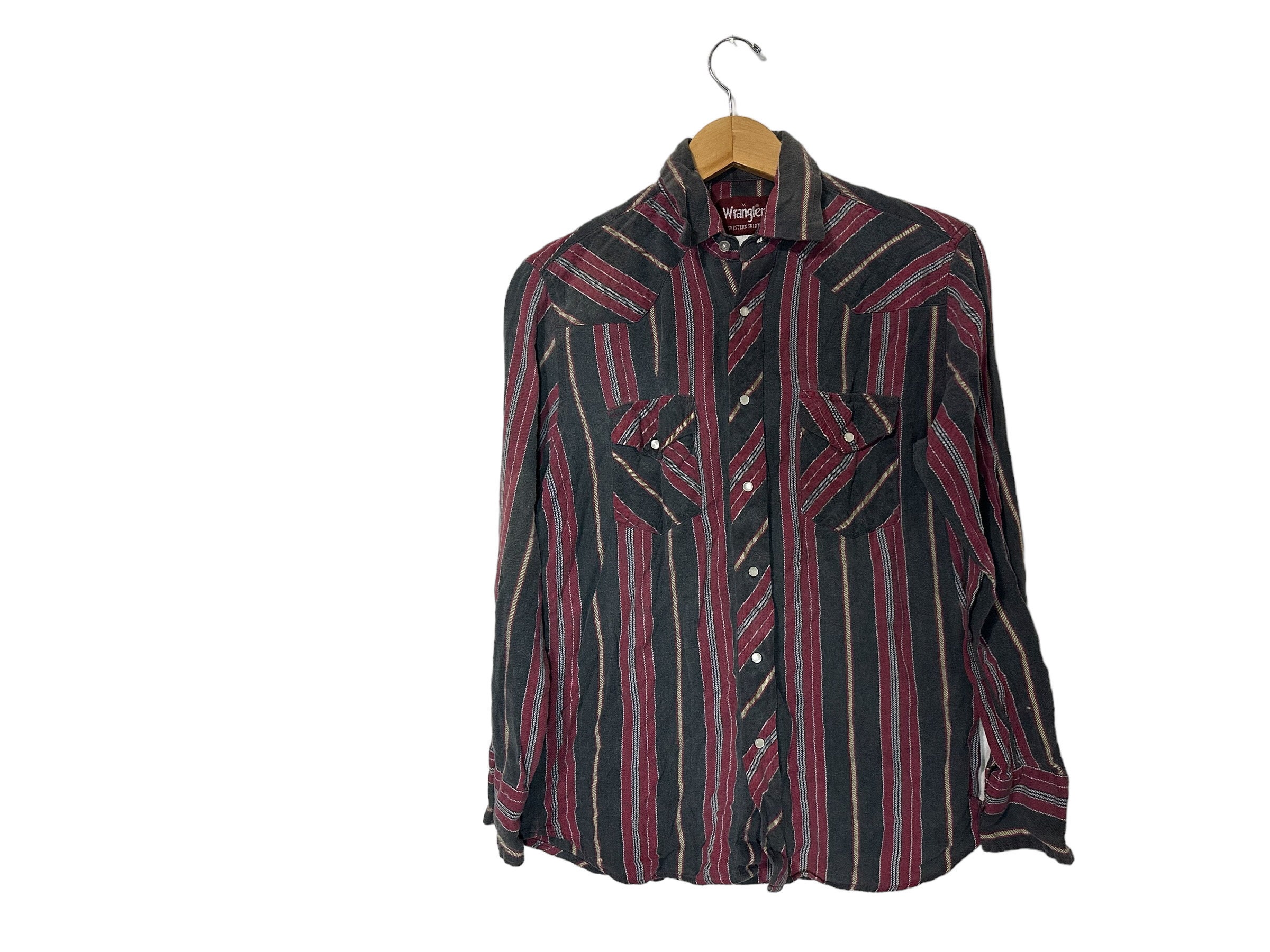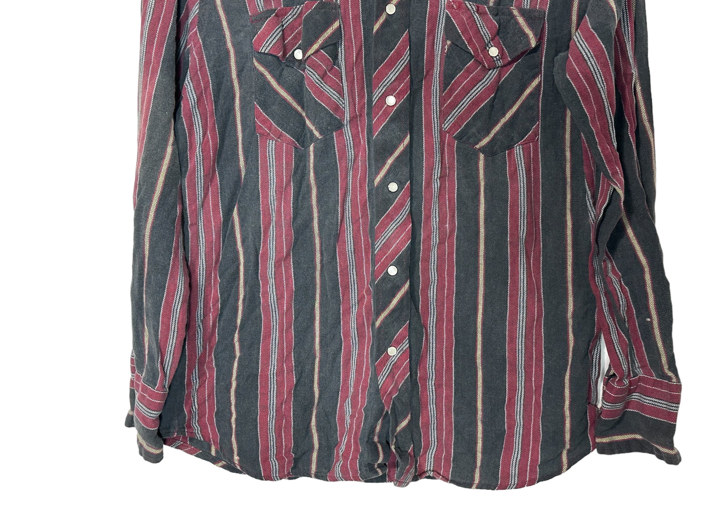 Striped Western Flannel Vintage Wrangler Pearl Snap Buttons Long Sleeve Pockets Red Black Unisex Size Medium - Damaged