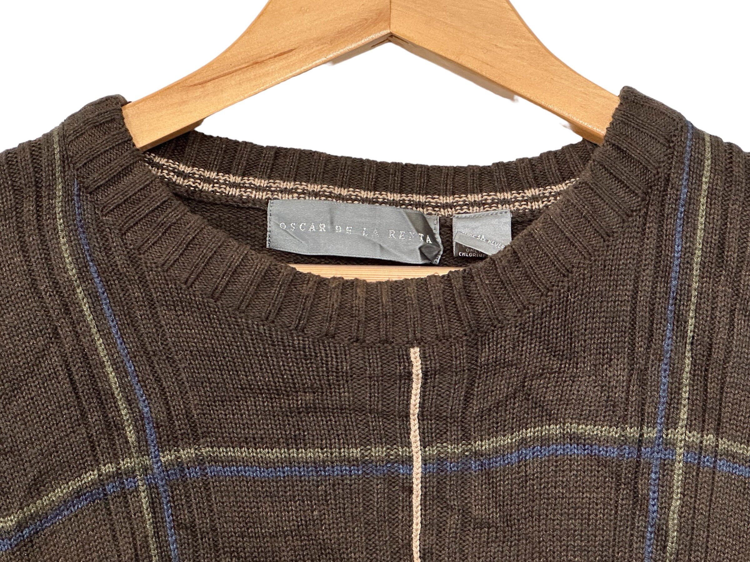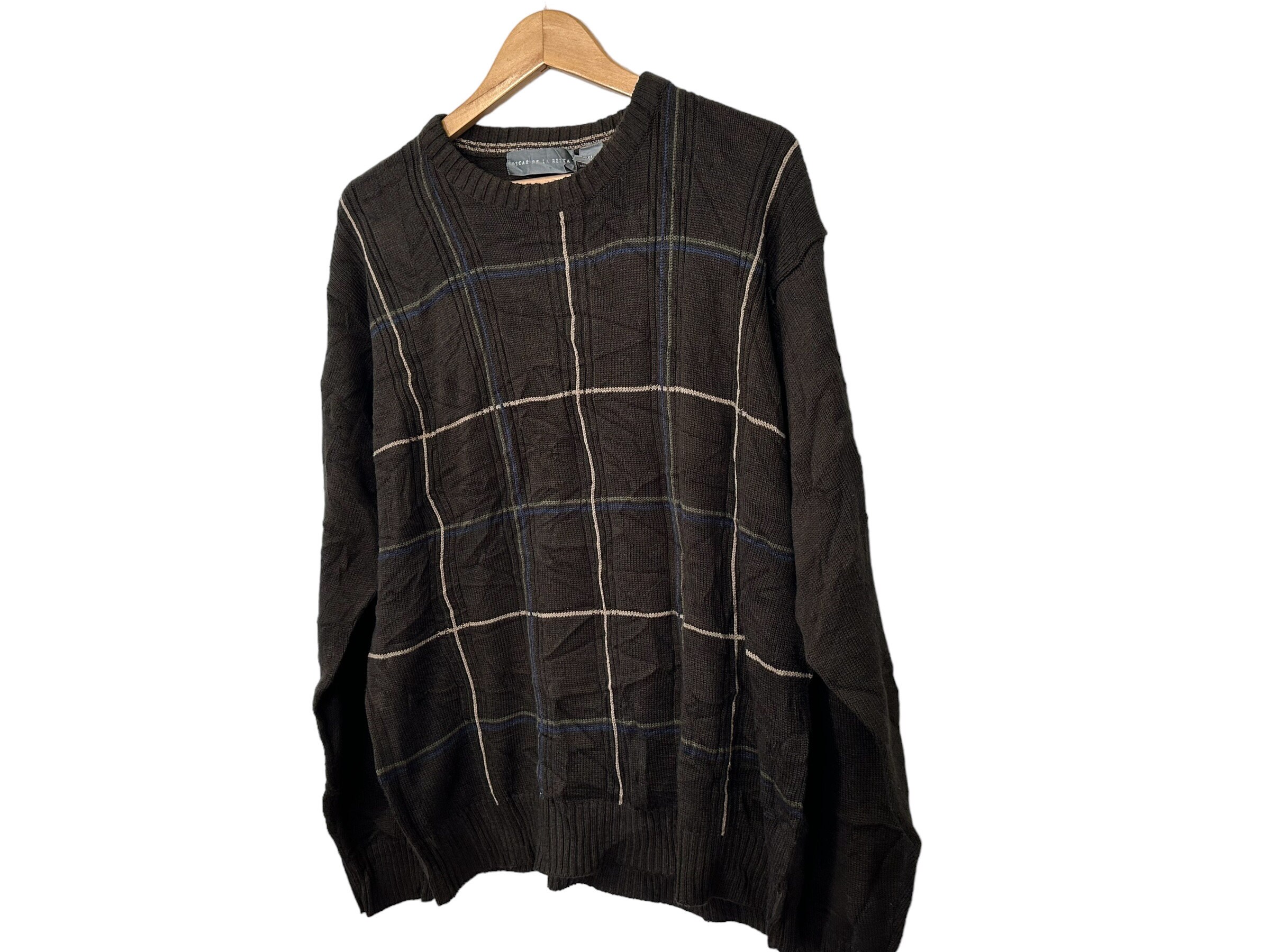 Oscar De La Renta Designer Sweater Vintage Brown Grid Line Striped Pullover Sweater Long Sleeve Men's XL