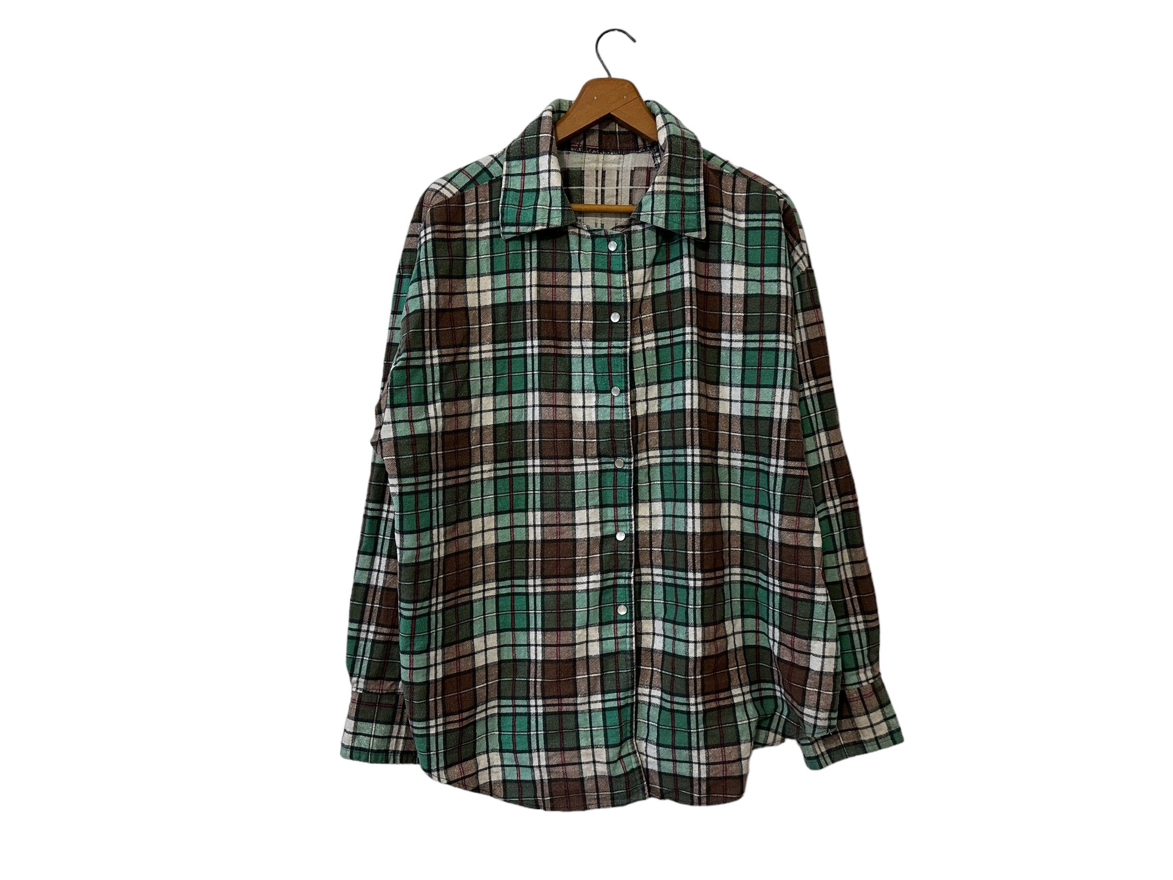 70s Vintage Flannel Shirt Green Brown Red White Pearl Snap Buttons Long Sleeve Cotton Blend Women's XL