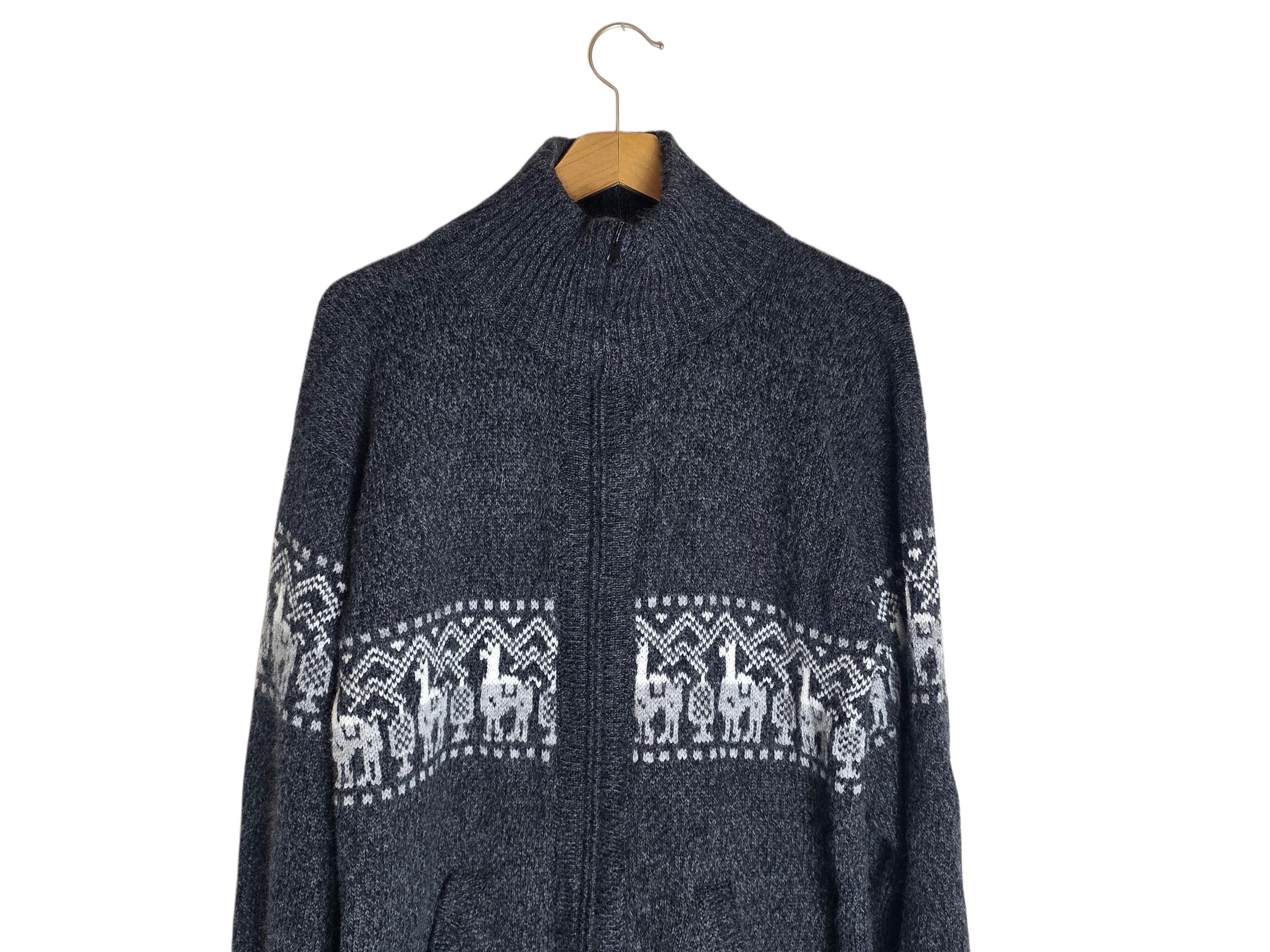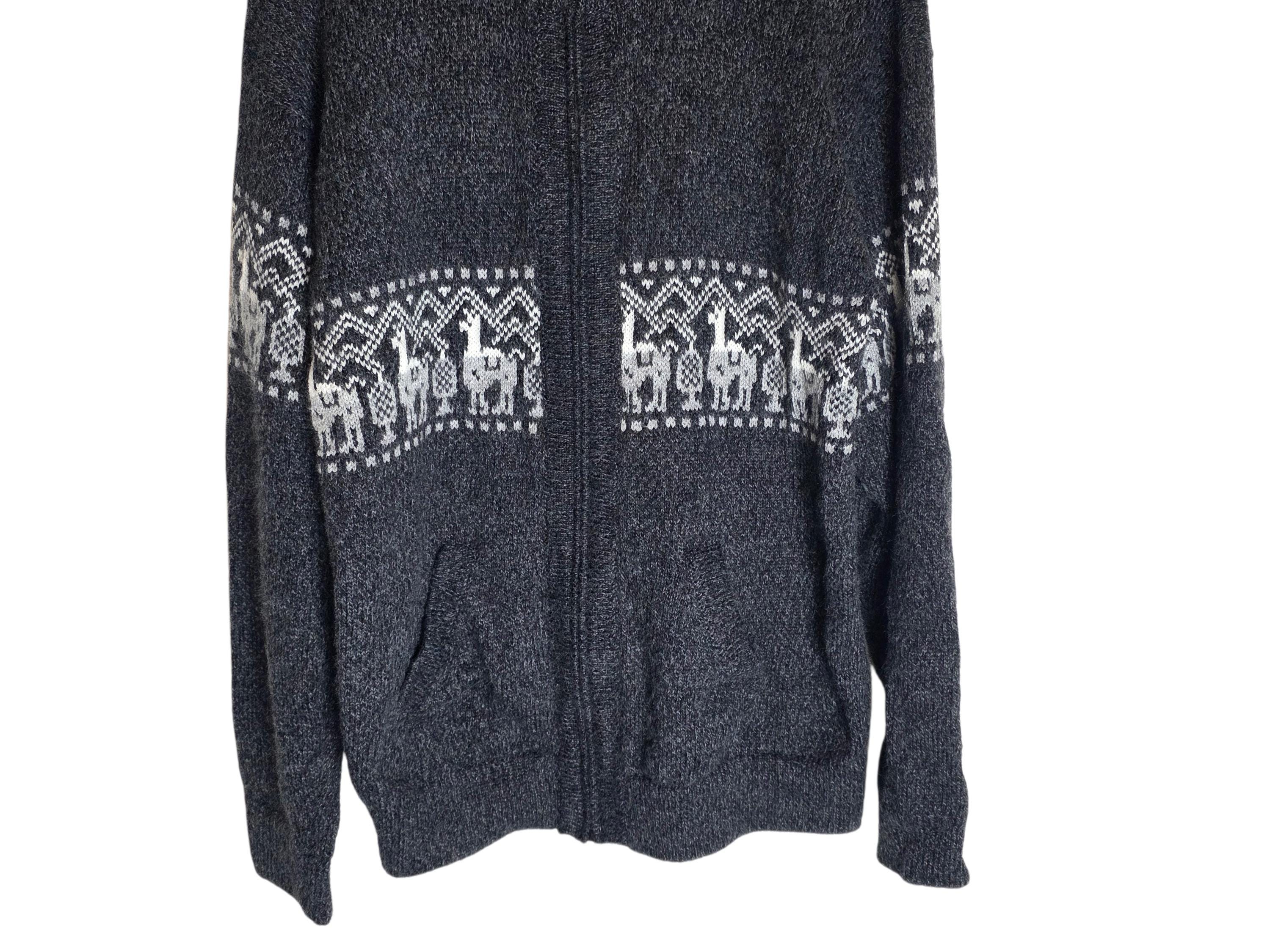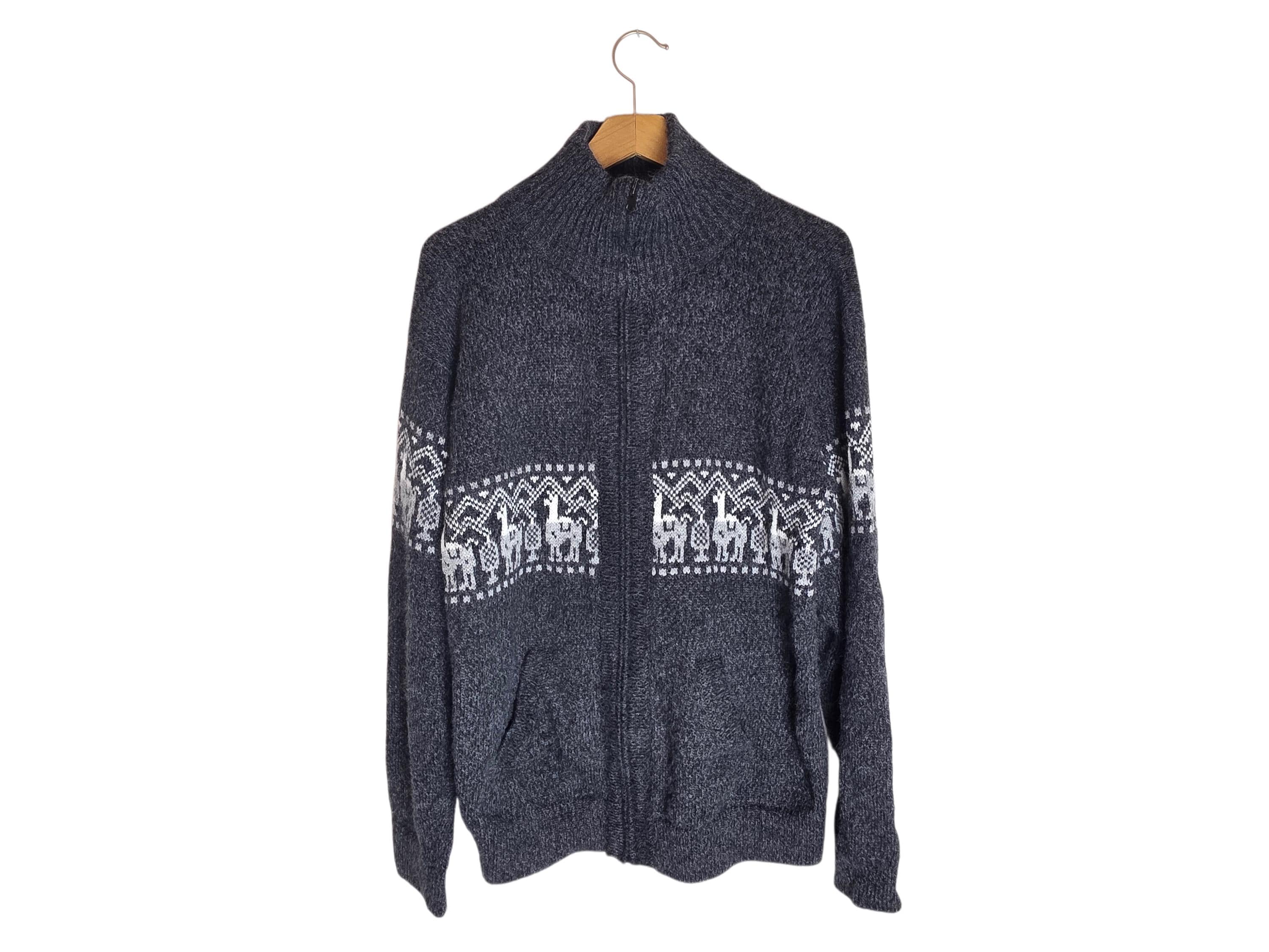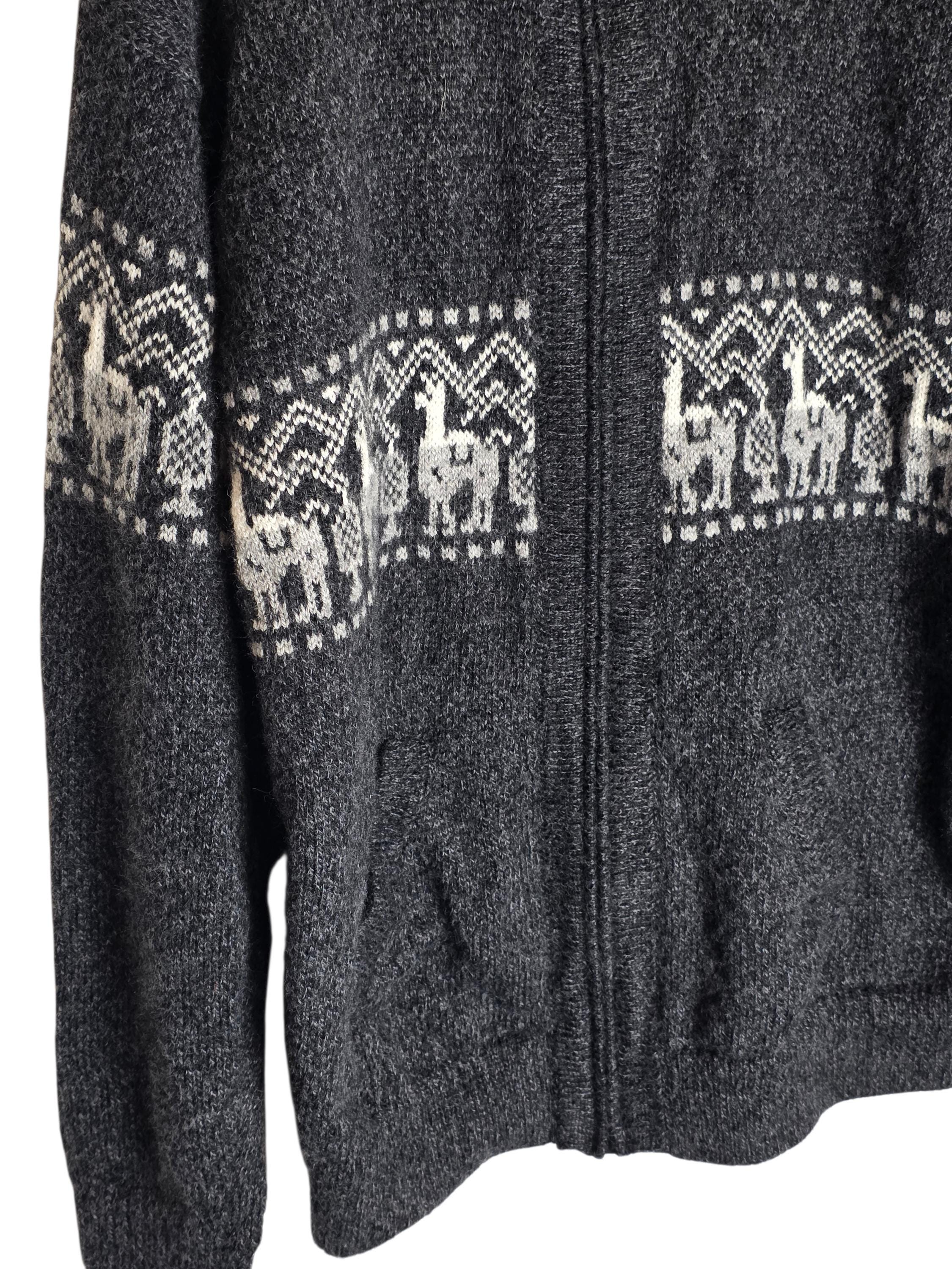 Alpaca Patterned Collared Zip Up Sweater Gray White Alpaca Wool with Pockets Size Medium